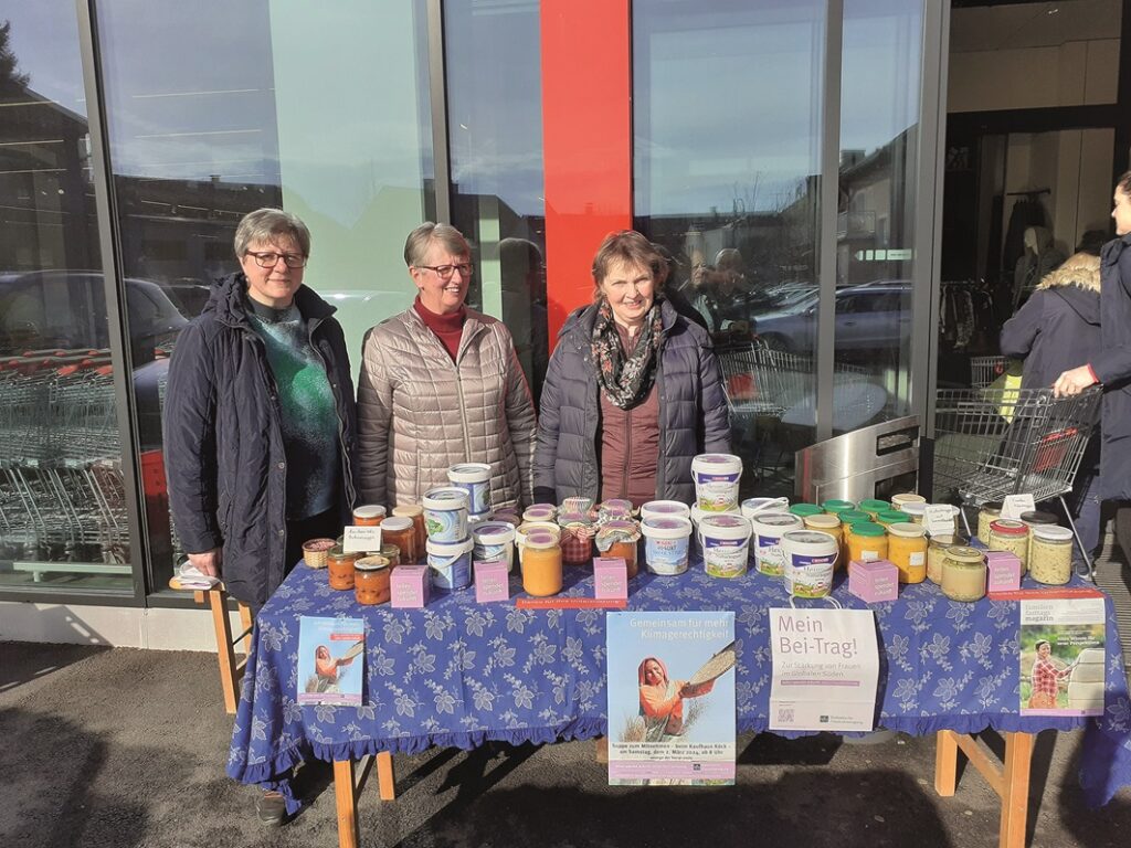 Seit 1958 gibt es die Aktion Familienfasttag der kfb. Dabei ruft die kfb immer am zweiten Freitag der Fastenzeit zu persönlichem Verzicht auf und bittet, das „gesparte“ Geld für Entwicklungsarbeit zu spenden. Heuer wurden in Kirchberg bei der Sammlung zum Familienfasttag 1.103,75 Euro gespendet. Vielen Dank! Darüber hinaus gibt es rund um diesen Tag auch verschiedene Aktionen der kfb. In Kirchberg ist dies seit Jahren die sogenannte „Suppenaktion“. Heuer fand diese am 3. Februar statt. Vor dem Kaufhaus Köck boten die Frauen, gegen eine Spende, selbstgemachte Suppen zum Mitnehmen an. Elf verschiedene Sorten standen zur Auswahl. Und es hat sich gelohnt, 720,00 Euro an Spenden konnten gesammelt werden. Vergelt´s Gott!