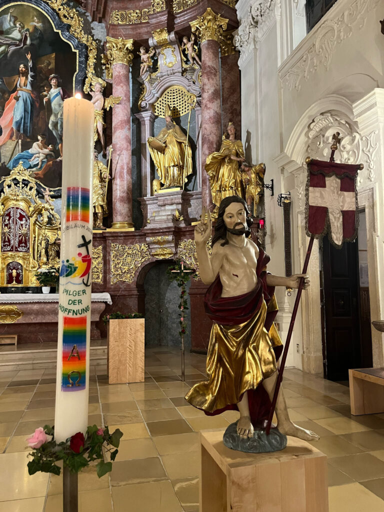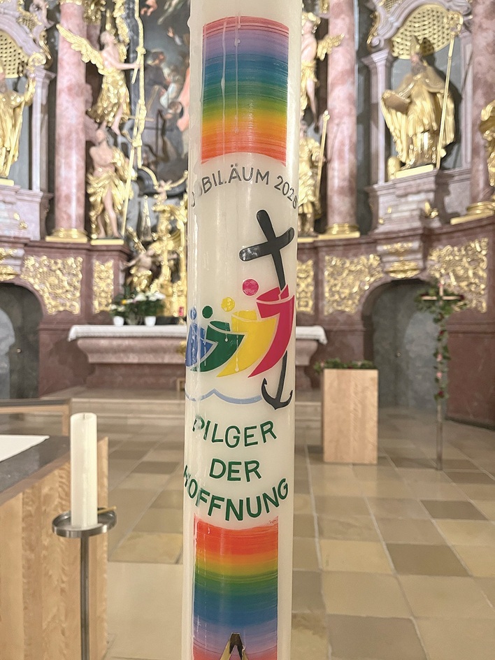 Mit diesen Worten zieht in der Osternacht der Priester oder der Diakon mit der Osterkerze in die dunkle Kirche ein. Sie symbolisiert die Auferstehung Jesu Christi, den Sieger über den Tod. Anschließend wird das feierliche Osterlob, das Exsultet, gesungen. Es ist ein besonderer Augenblick. Das ganze Jahr begleitet uns die Osterkerze an den Sonn- und Feiertagen, bei kirchlichen Feiern, von der Taufe eines Kindes bis zum letzten Weg eines Menschen. Heuer im „Heiligen Jahr“ ist das Motiv „Pilger der Hoffnung“ auf der aktuellen Osterkerze dargestellt.
