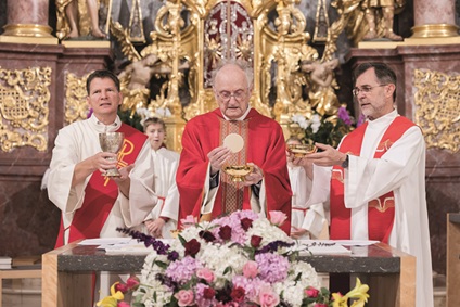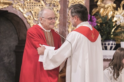 Am letzten Sonntag im Juli beging die Pfarre Kirchberg ihr Patrozinium. Im Rahmen dieses Gottesdienstes feierte Pfarrer Johannes Grill sein diamantenes Weihejubiläum, also 60 Jahre Priester. Mit ihm zelebrierten die Messe Diakon Thomas Burgstaller und Bischofsvikar Josef Grünwidl, der auch die Festpredigt hielt, in der er eien Überblick über 60 Jahre pastorales Wirken unseres Jubilars gab. Zu diesem Anlass waren auch seine ehemaligen „Schäfchen“ aus Breitenwaida bei Hollabrunn mit einem Autobus angereist. Den musikalischen Rahmen gestaltete das „Chorchester“ mit der „Mettenmesse“ (eine Hommage an seine Primiz im Jahr 1965) sowie einem „Tantum ergo“ von Robert Führer beim abschießenden eurcharistischen Segen. Im Anschluss an den Festgottesdienst wurden – wie sonst auch beim Jakobifest üblich – auf dem Florian Kuntner-Platz Getränke serviert und Würstel gekocht. Heuer fiel aber wegen zunehmen schlechten Wetters das augedehnte gemütliche Beisammensein buchstäblich ins Wasser, einige wetterfeste Besucher ließen sich aber nicht unterkriegen. Vielen Dank an alle fleißigen HelferInnen für den zügigen Auf- und Abbau.